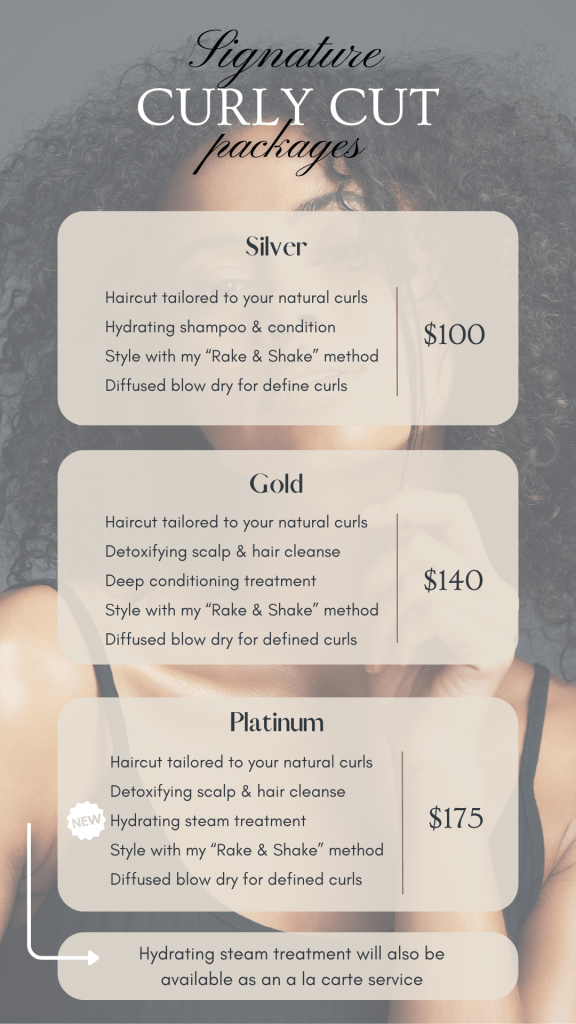 - My service menu will get some updates that will go into effect February 1, 2024. The new & improved service menu will be all about promoting hair health. My “Signature Curly Cut” will be a three-tiered service now with Gold, Silver, and Platinum package offerings. Haircolor & blonding services will include B3 bond builder to fortify the hair during application & processing time. You can also look forward to a new hair steaming service (the ultimate hydration for your hair) you can select as a solo service or as part of my Platinum package.