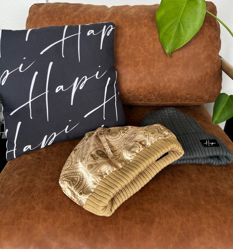 These HAPI beanies are satin-lined to protect the health of your hair and also include an opening at the top designed for your pony “poof” or “tail” to fit through. As of now, you can pick one up at the Studio on your way out or pull a drive-by anytime.